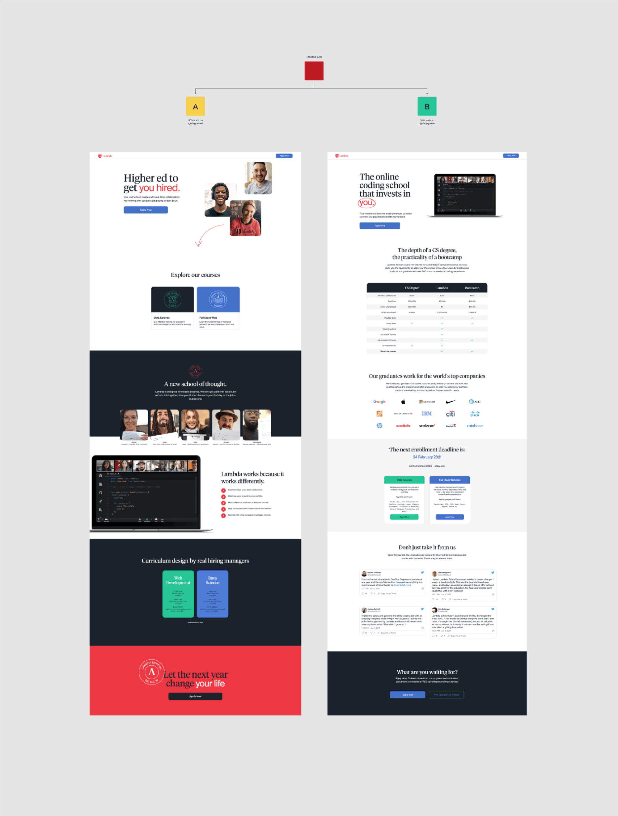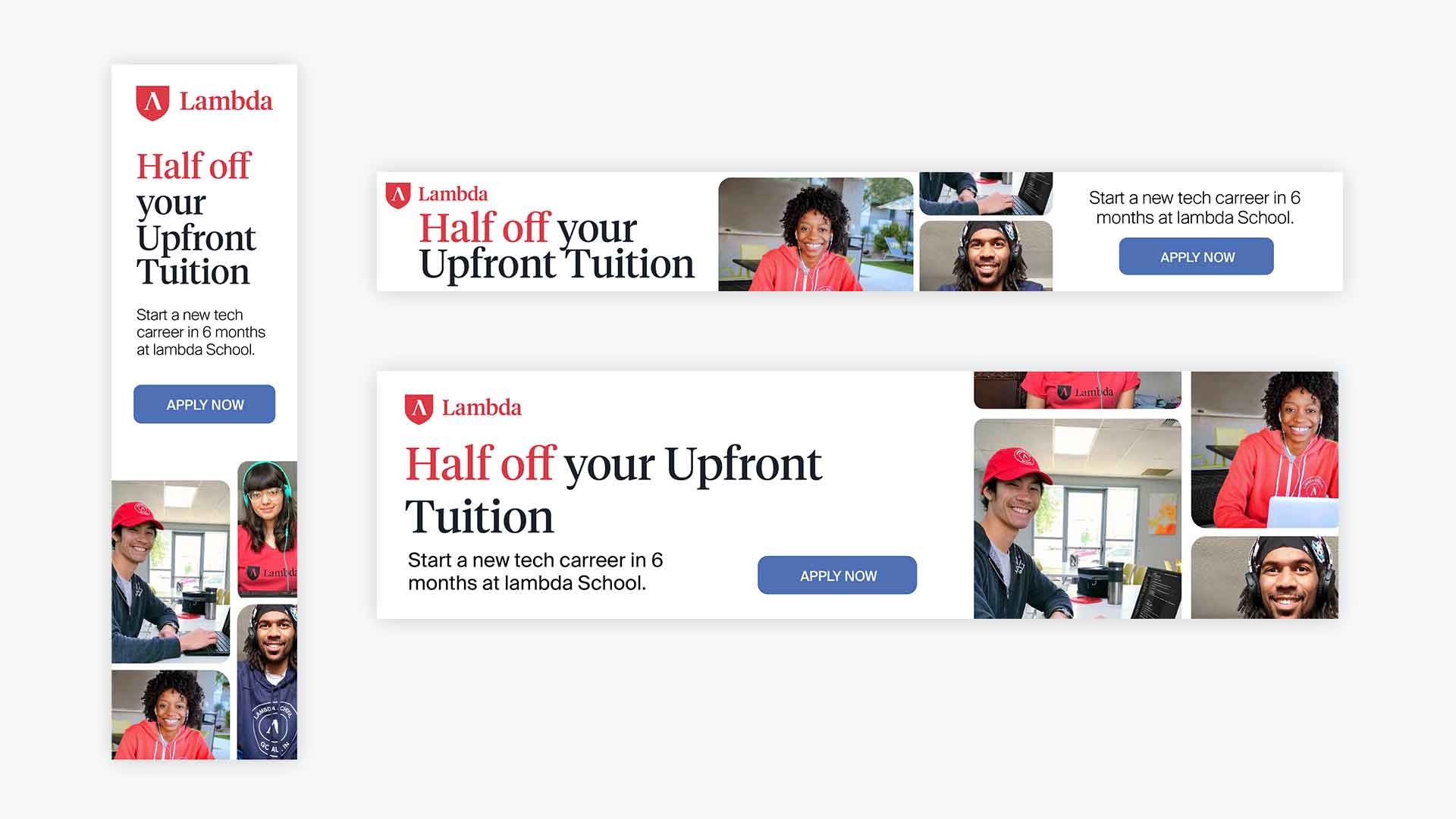 At Lambda School, I partnered with Marketing and Growth Managers to design experiences optimizing for acquisition. My process often started with analyzing available data, articulating hypotheses, designing, testing, and iterating. Samples of the assets I designed are below. More available upon request.